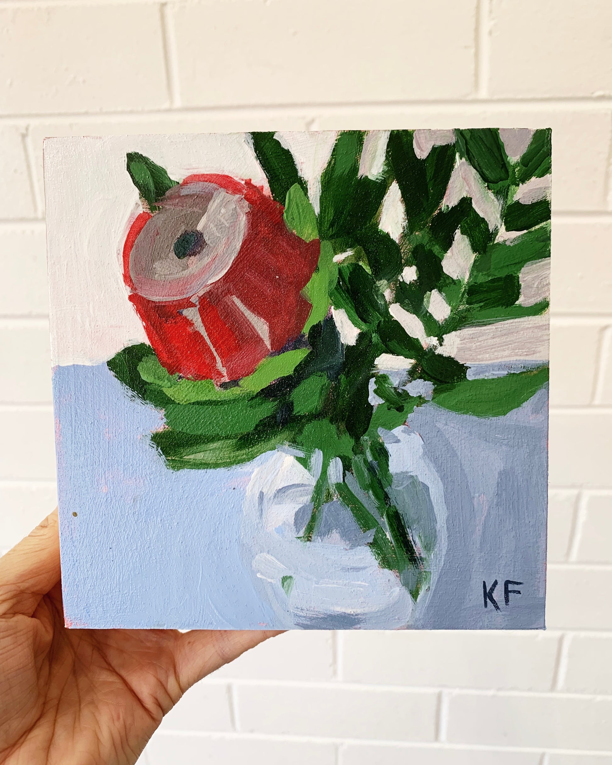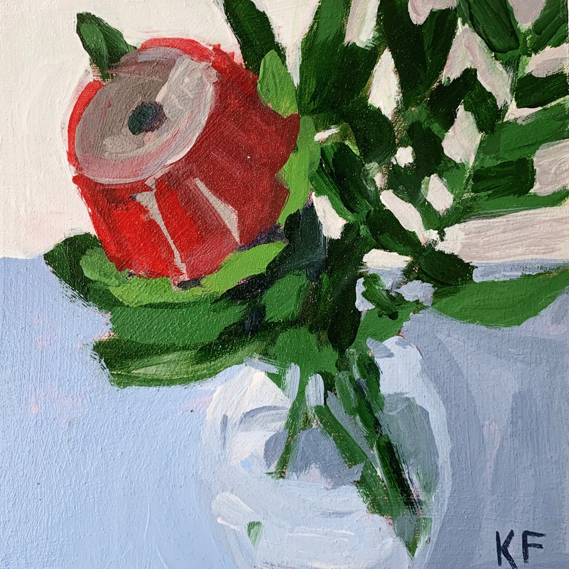 A contemporary floral painting focused on colour, shape, and texture.
